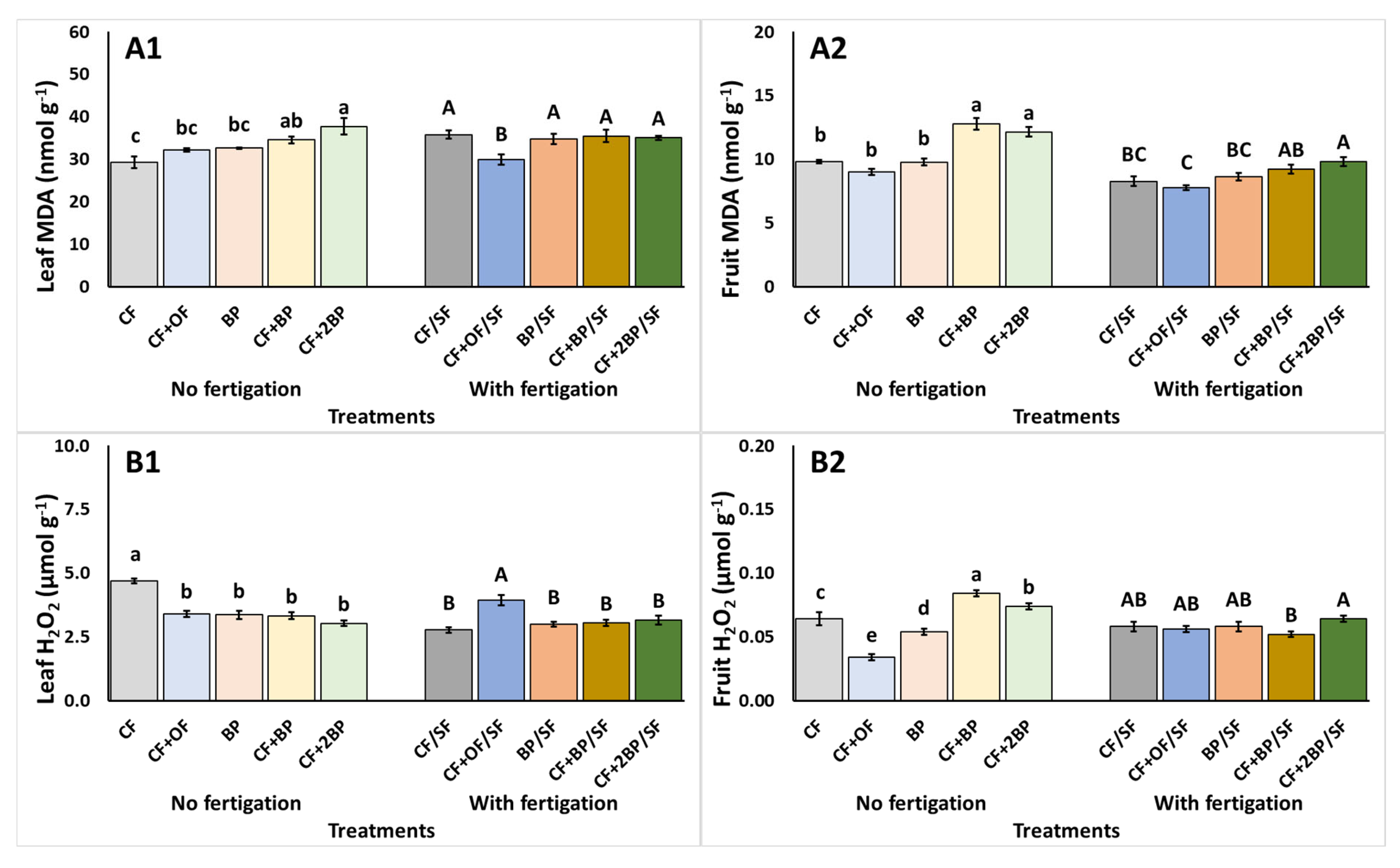 4.6. Leaf and Fruit Total Phenols Content, Antioxidant Activity, and Stress Indicators