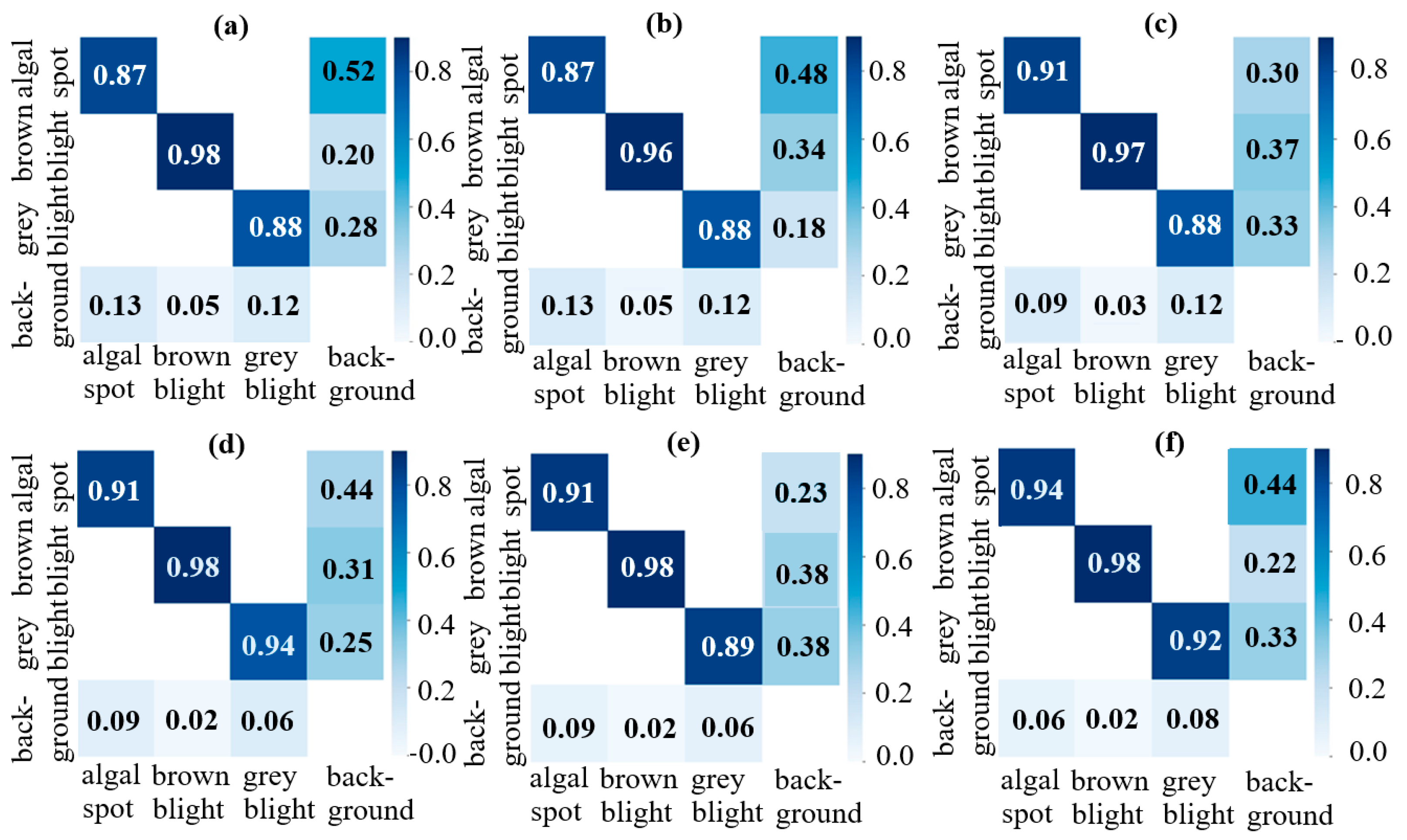 - Wang, J.; Li, M.; Han, C.; Guo, X. YOLOv8-RCAA: A lightweight and high-performance network for tea leaf disease detection. Agriculture 2024, 14, 1240. [Google Scholar] [CrossRef]