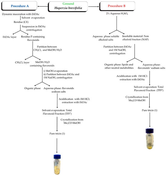 Figure 3) were thus explored, using the same lot of botanical material. Procedure A was mainly based on liquid–liquid partitioning, while the different acidic and basic properties of metabolites were exploited in procedure B. However, both processes A and B finally afforded a total flavonoid fraction (TFF