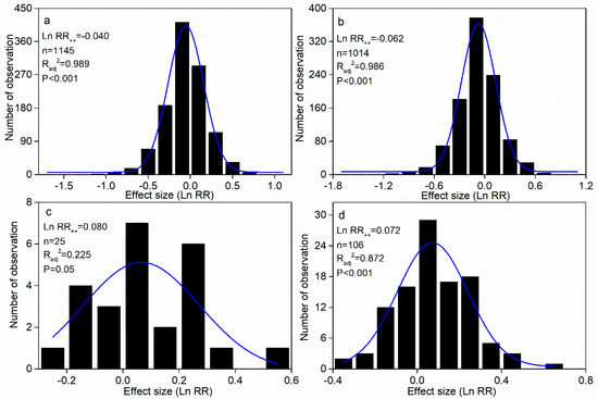 Frequency distribution of natural log response ratio (Ln RR) in total (a), common litter (b), common soil (c), and in situ (d) traits.