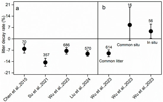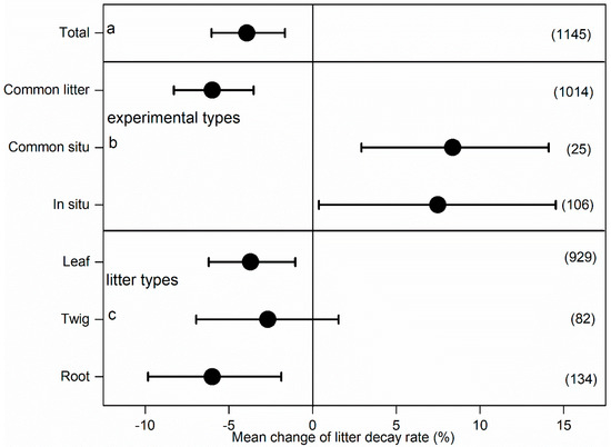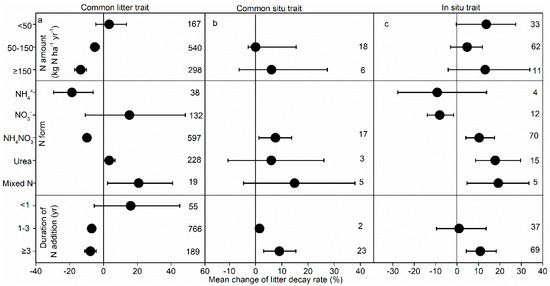 Our meta-analysis investigated the impact of N addition on the litter decay rate using three kinds of litter decay traits in global forests. Across the three kinds of litter decay traits, N addition notably slowed the litter decay rate by 3.92%, consistent with previous meta-analysis about N influencing litter decay in regional and global forests [13,24,25]. In addition, our results clearly demonstrated that N addition differently influenced the litter decay rate among three kinds of traits. Specifically, N addition markedly slowed the litter decay rate by 5.99% for the common litter trait but markedly accelerated the litter decay rate by 8.37% and 7.48% for the common situ and situ traits, respectively (Figure 2b). These findings provide a comprehensive understanding of the impacts of N addition on the decay rate of global forest litter.