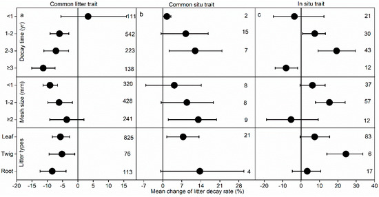 The decay time significantly influenced the effect size on the litter decay rate of N addition (Figure 5). Short-term N addition (<1 yr) did not markedly influence litter decay for the three kinds of traits (Figure 5). Specifically, the negative effect of N influencing the decay rate was stronger for decay time ≥1 yr in the common litter trait (Figure 5a). N addition markedly enhanced the litter decay rate for a decay time of 2–3 yr in common soil and situ traits (Figure 5b,c) but notably decreased decay for the in situ trait with decay time ≥3 yr.