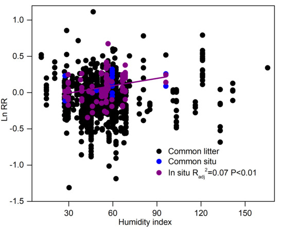 The effect size of the litter decay rate to N addition is positively correlated with the effect size of lignin concentration and lignin/N to N addition in the situ decay trait, which also further demonstrated that litter quality plays an important role in influencing the litter decay rate [21,22]. In addition, the humidity index was positively associated with the effect size of the litter decay rate regarding its response to N addition (Figure 6), indicating that the increase in the humidity index magnifies the positive effect of N addition on the litter decay rate. In moisture-limited ecosystems, particularly arid and semi-arid biomes, water constraints may supersede N controls in determining the decay rate due to the critical role of water in mediating microbial metabolic processes [5,51]. Our study suggested that the interaction between water and N plays a vital role in controlling the decay of global forest litter.