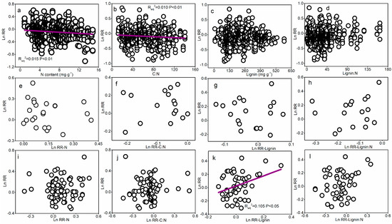 The MAP, MAT, and humidity index altered the effect size of the litter decay rate in regard to N addition (Figure S3 and Figure 6). For the situ trait, there was a positive relationship between the humidity index and the effect size of the decay rate, but effect size did not show any significant correlations with the humidity index in common litter and soil traits (Figure 6). N addition significantly enhanced litter N concentration, reduced C:N and lignin/N ratios (Figure S4), and influenced N effects on the decay rate (Figure 7). Specifically, as litter N concentration and the C:N ratio increased, the Ln RR decreased linearly for the common litter trait (Figure 7a,b). There was no marked correlation between Ln RR and lignin concentration and lignin/N (Figure 7c,d). Conversely, there was a positive relationship between the Ln RR–lignin and Ln RR–lignin/N and the Ln RR of the decay rate for the situ trait (Figure 7k,l) but not for the common soil trait (Figure 7g,h). There was no significant relationship between Ln RR and Ln RR-N (or LnRR-C:N) for common soil and situ traits (Figure 7e,f,i,j).