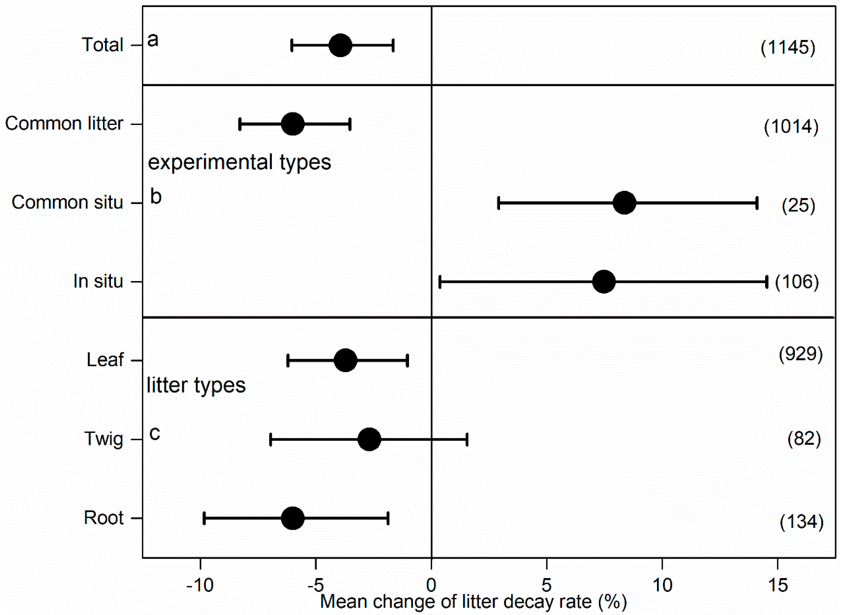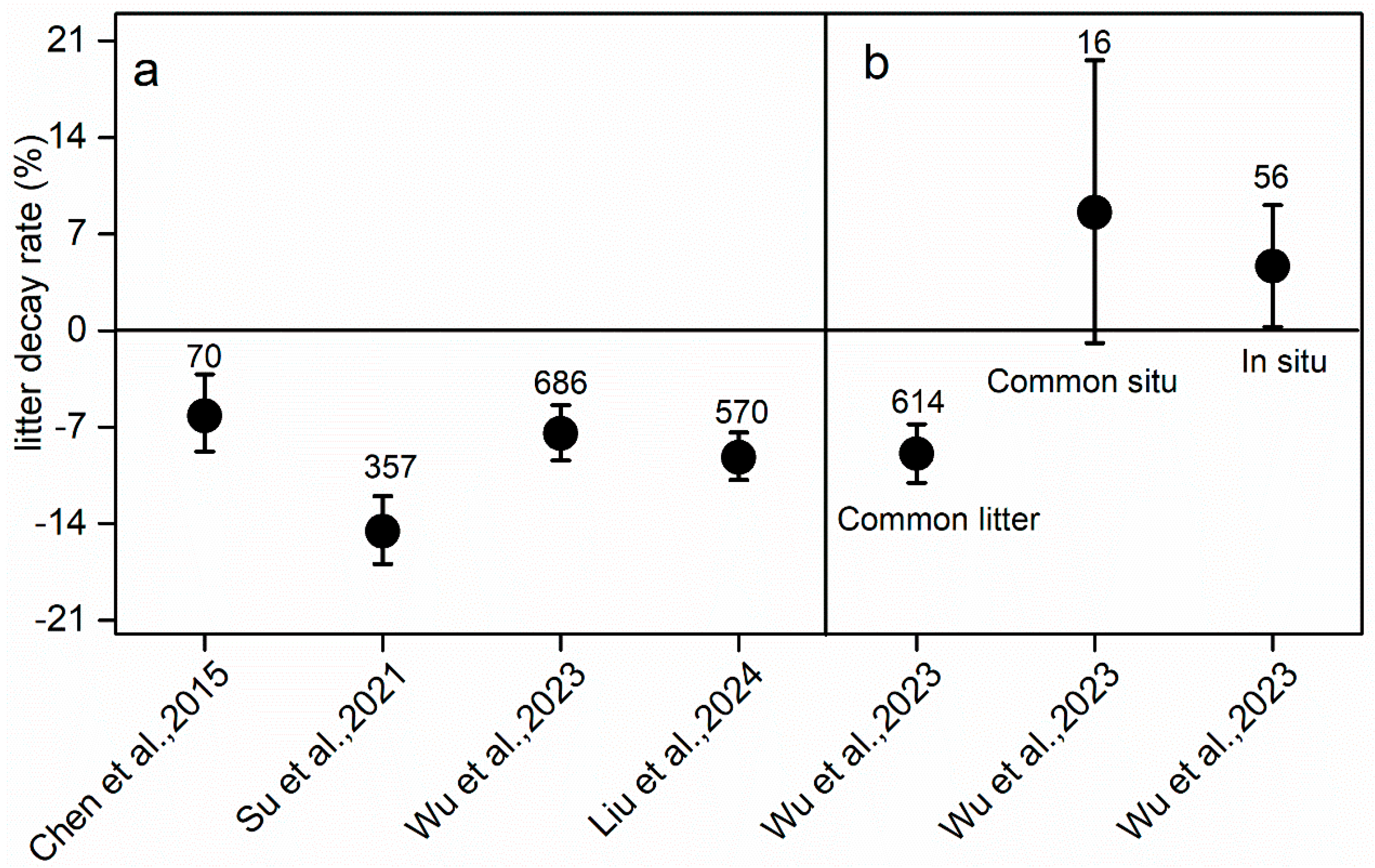 - Liu, Y.L.; Zhang, A.L.; Li, X.Y.; Kuang, W.N.; Islam, W. Litter decomposition rate response to multiple global change factors: A meta-analysis. Soil Biol. Biochem. 2024, 195, 109474. [Google Scholar] [CrossRef]