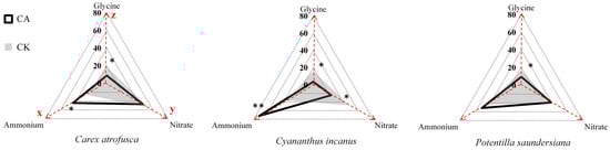 Among the three associated species—C. atrofusca, C. incanus, and P. saundersiana—clear shifts in N uptake were observed between CA and CK soils, reflecting their adaptive strategies and ecological niche differentiation. In CK, C. atrofusca increased its glycine uptake from 8.93% in CA to 18.69%, while its NH4+ uptake declined from 44.18% to 25.72%. This adjustment likely reflects the reduced availability of ammonium in CK soils, prompting greater reliance on glycine. Notably, C. atrofusca maintained the highest NO3− uptake ratio among the three species under both conditions, suggesting a consistent preference for nitrate. Similar nitrate affinity has been reported in other alpine sedges such as Carex parvula and C. alatauensis [45,46].
