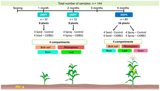 Sampling design and timeline of the experiment. For each treatment, one maize plant from the central row of each plot was randomly selected (4 plants per treatment; 16 plants total). Sampling was performed at two time points: (i) 1MPT (one month after treatment: 1 month after sowing for seed application and 2 months for spray application) and (ii) 4MPS (4 months after sowing, reproductive stage R4). Bulk soil, rhizosphere, root, leaf and grain samples were collected from each plant (n = 32 per compartment, except grains). Grains were sampled only at 4MPS (n = 16). In total, 144 samples were analyzed.