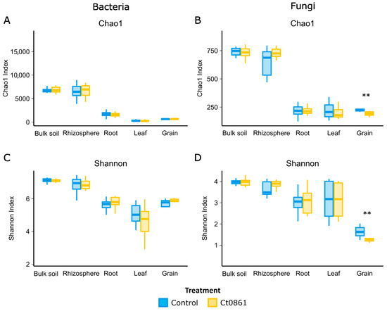 Alpha-diversity of maize-associated microbiome treated or not with Ct0861. Chao1 (A,B) Shannon indexes (C,D) of bacterial and fungal communities in different compartments (bulk soil, rhizosphere, root, leaf and grain) treated or not with Ct0861. Internal line in box-plot boxes indicates the median or second quartile (Q2), upper line of the boxes indicates the third quartile (Q3) and lower line the first quartile (Q1) of the data. Asterisks denote statistically significant differences in non-parametric Wilcoxon-Mann–Whitney Test (p < 0.01 **).