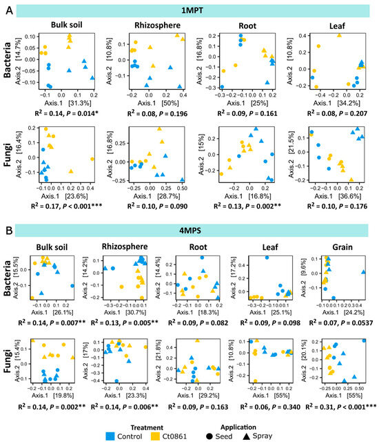 Beta-diversity patterns of the maize-associated microbiome of plants treated or not with Ct0861. Principal coordinate analysis (PCoA) based on Bray–Curtis dissimilarity of bacterial and fungal communities in each compartment unconstrained by “treatment” and “application” at sampling time point: (A) 1MPT (one month post-treatment) and (B) 4MPS (four months post-sowing). The relative contribution (R2) of the factor “treatment” on community dissimilarity and its significance were tested with PERMANOVA (n = 16). (p < 0.05 *, p < 0.01 **, p < 0.001 ***).