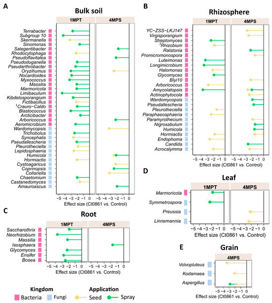 Differentially abundant genera were predominantly detected in soil compartments (bulk soil and rhizosphere) of Ct0861-treated plants, under different conditions of sampling time and application method (Figure 4, Table S8). Within plant compartments, only a few taxa showed differential depletion: seven bacterial genera in the roots, one bacterial and three fungal genera in the leaves, and one bacterial and three fungal genera in the grains. In all cases, these changes reflected a depletion effect. Of particular interest, the fungal genus Aspergillus was significantly reduced in grains of Ct0861-treated plants compared to controls, both in seed and spray application (Figure 4E and Table S8).