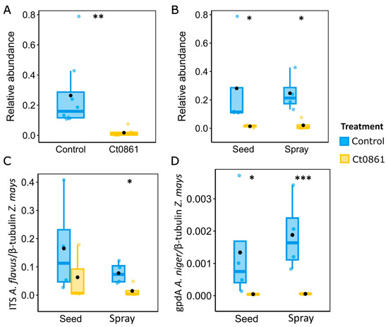 Quantification of Aspergillus spp. in the grains of maize plants treated or not with Ct0861. (A) Relative abundance of Aspergillus spp. in the aggregated data set of grains of maize plants treated or not with Ct0861. (B) Relative abundance of Aspergillus spp. in grains of maize plants treated or not with Ct0861 either as seed or spray application. Quantification by qPCR of (C) A. flavus and (D) A. niger biomass in grain samples of maize plants treated or not with Ct0861 either on the seed before sowing or as a spray at one month after sowing. Internal line in box-plot boxes indicates the median or second quartile (Q2), upper line of the boxes indicates the third quartile (Q3) and lower line the first quartile (Q1) of the data. Mean is represented by a black dot. Asterisks denote statistically significant differences in Student’s t-test (p < 0.05 *, p < 0.01 **, p < 0.001 ***).