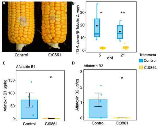 Protective effect of Ct0861 treatment on maize grains infected with A. flavus. (A) Representative image showing the mycelial growth of A. flavus at 21 dpi on the inoculation site in cobs of maize plants inoculated or not with Ct0861. (B) Quantification of A. flavus biomass in grains of maize plants inoculated or not with Ct0861 at five and 21 dpi with A. flavus strain NRRL 6540. Aflatoxin B1 (C) and B2 (D) concentration (µg/kg) in grains of maize plants inoculated or not with Ct0861 at 21 dpi with A. flavus strain NRRL 6540. Internal line in box-plot boxes indicates the median or second quartile (Q2), upper line of the boxes indicates the third quartile (Q3) and lower line the first quartile (Q1) of the data. Mean is represented by a black dot. Asterisks denote statistically significant differences in Student’s t-test (p < 0.05 *, p < 0.01 **).