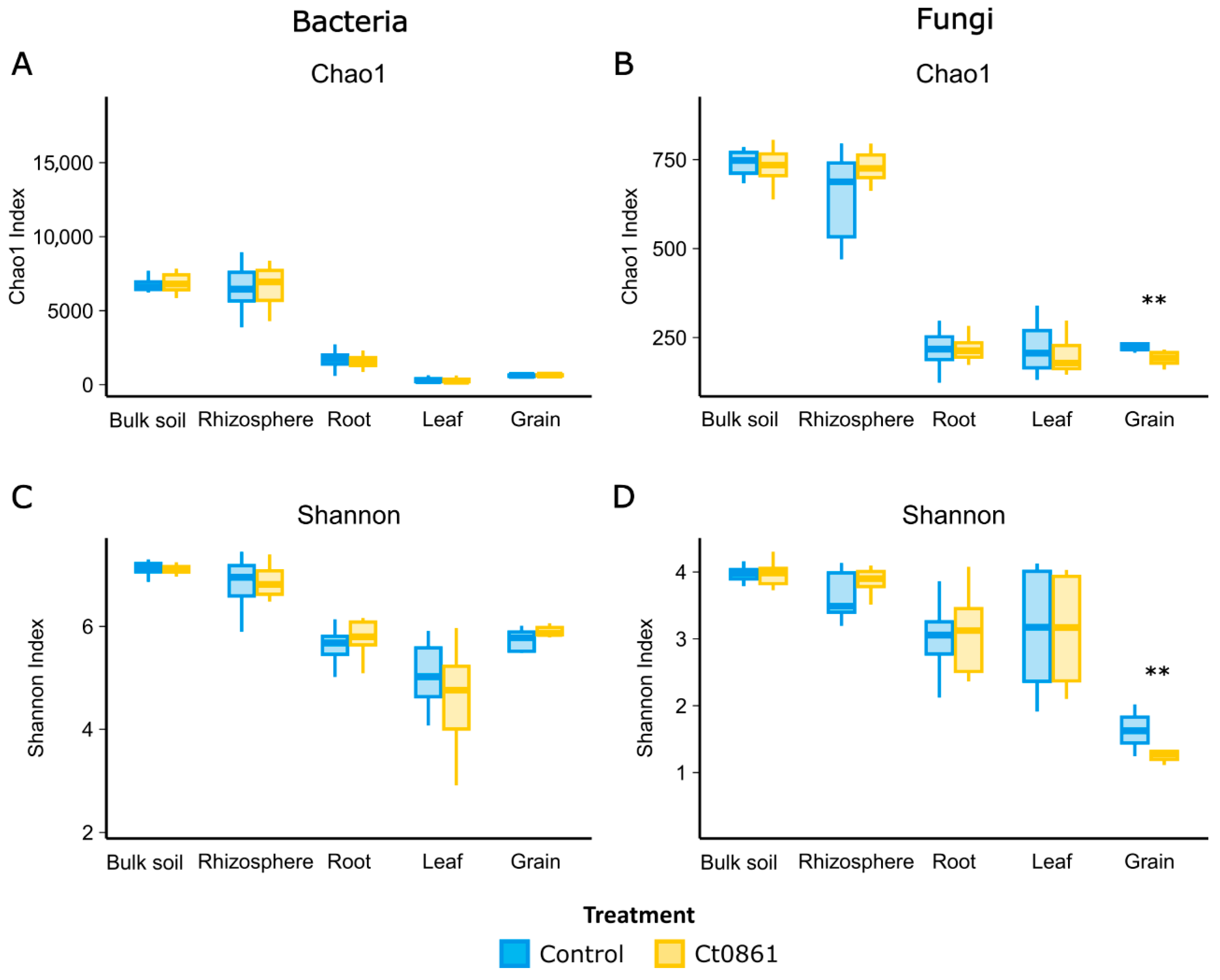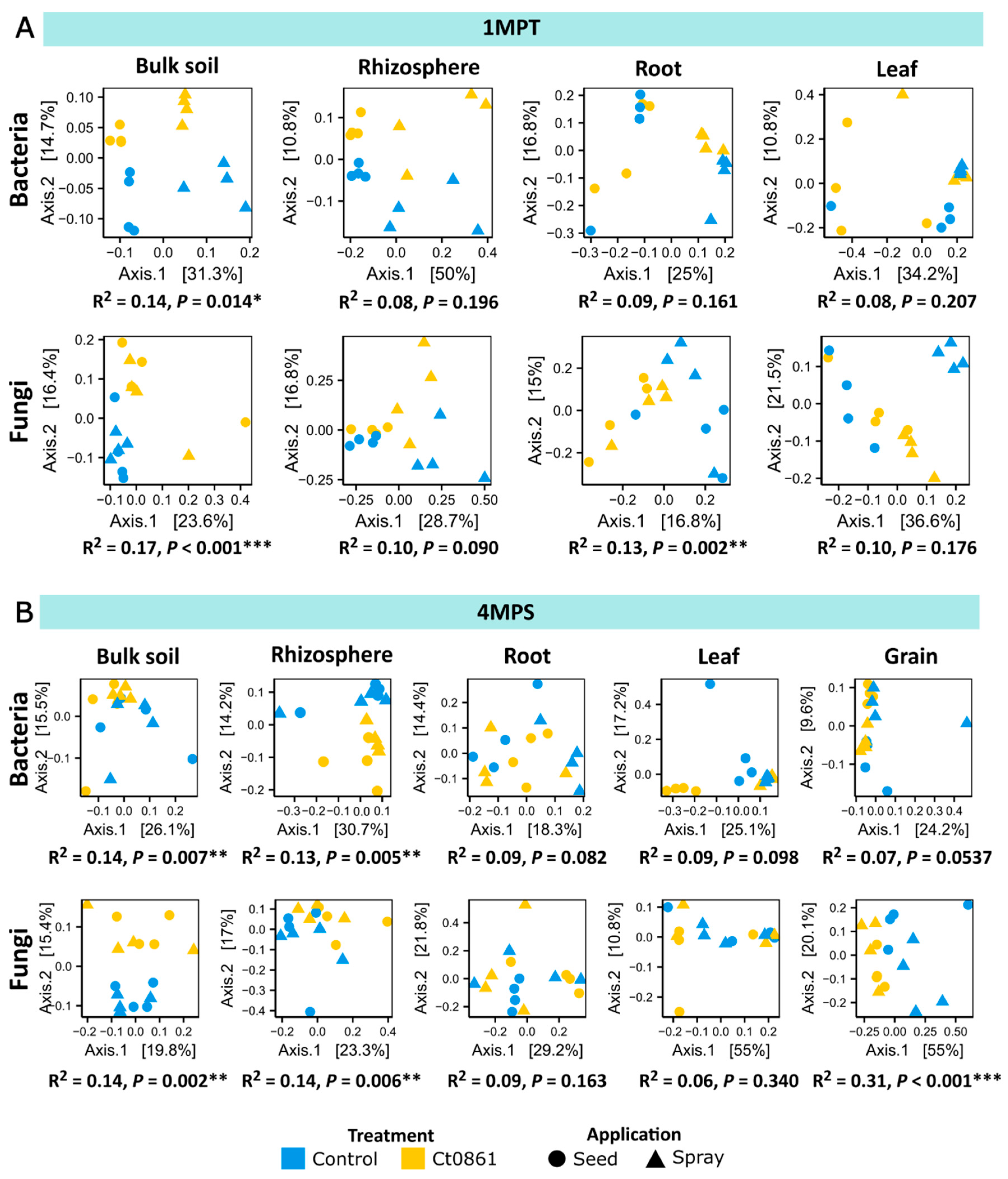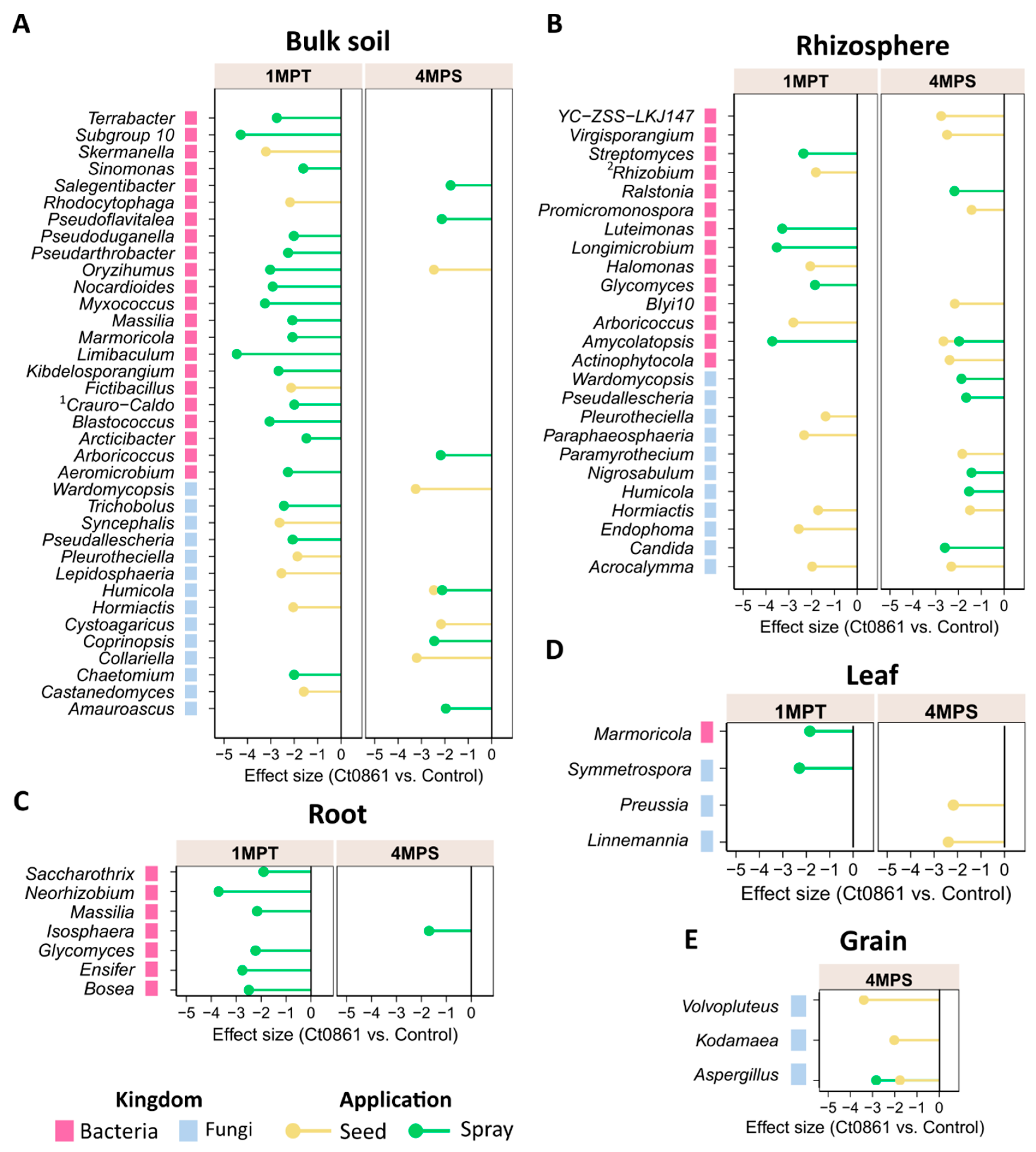3.3. Ct0861 Application Exerts an Influence on Microbial Beta-Diversity, Mainly in the Soil Compartments and the Grain