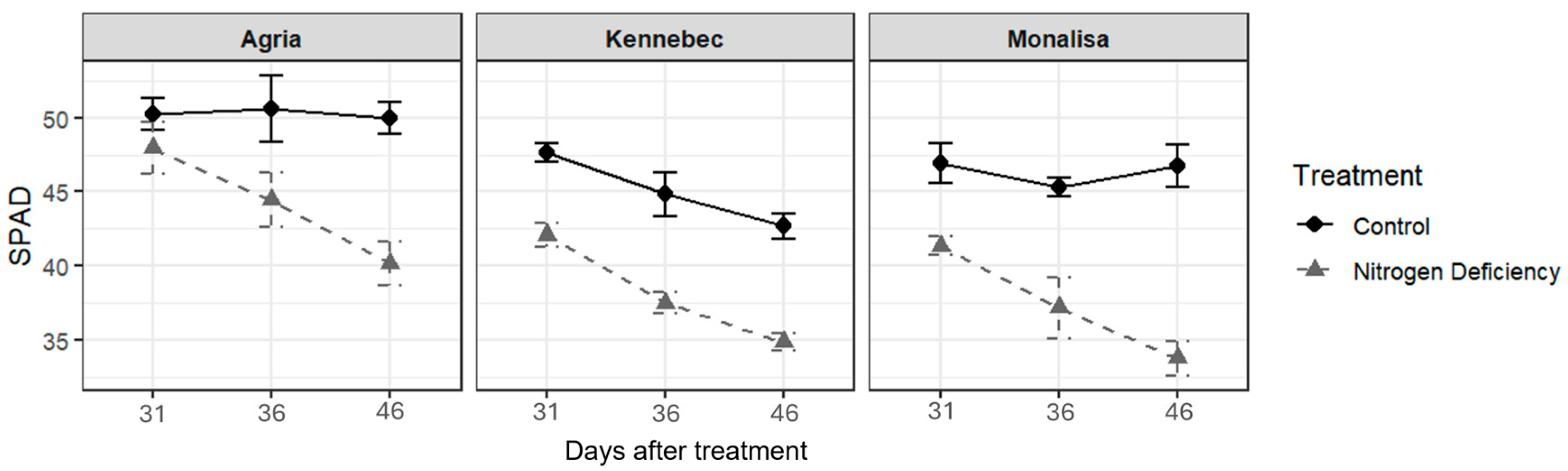 Chlorophyll Content | Transpiration | Stomatal Conductance | Nitrogen in Leaf | Nitrogen in Tuber | Leaf Area | Yield | Tuber Number | Leaf Biomass | Tuber Biomass | |