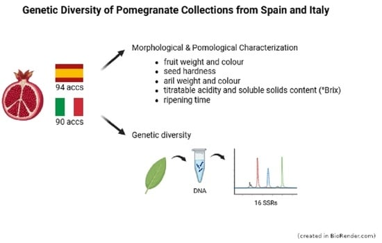 - Parashuram, S.; Singh, N.V.; Gaikwad, N.N.; Corrado, G.; Roopa Sowjanya, P.; Basile, B.; Devaraja, N.S.; Chandra, R.; Babu, K.D.; Patil, P.G.; et al. Morphological, Biochemical, and Molecular Diversity of an Indian Ex Situ Collection of Pomegranate (Punica granatum L.). Plants 2022, 11, 3518. [Google Scholar] [CrossRef] [PubMed]