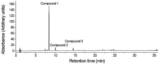 The samples (crude extract and hydrolysis reaction products) were analyzed on a Dionexin vit Ultimate 3000 system (Thermo Scientific, San Jose, CA, USA). The system was equipped with a pump, an autosampler, and a photodiode array detector (DAD). The stationary phase was a Hypersyl Gold RP column (Thermo Scientific; 150 mm × 2.1 mm id; 1.9 µm particle size), operated at 40 °C. The eluents were water/formic acid (99.9/0.1 v/v) (eluent A) and acetonitrile (eluent B). The elution program was 0–4 min, linear gradient from 5 to 20% B; 4–10 min, isocratic at 20% B; 10–12 min, linear gradient from 20 to 25% B; 12–16 min, isocratic at 25% B; 16–22 min, linear gradient from 25 to 52% B; 22–26 min, isocratic at 52% B; 26–30 min, linear gradient from 52 to 70% B; 30–33 min, linear gradient from 70 to 100% B; 33–36 min, isocratic at 100% B; 36–41 min, linear gradient from 100 to 5% B; 41–46 min, isocratic at 5% B. The flow rate was 400 μL/min with an injection volume of 5 μL.