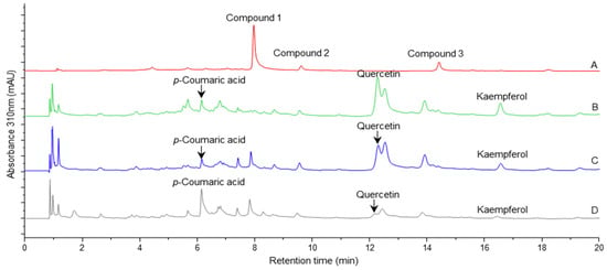Chromatographic profile of the different hydrolysates as recorded at 310 nm between 0 and 20 min. (A) Non-hydrolyzed extract. (B) Hydrolysis at 80% (v/v) methanol. (C) Hydrolysis at 75% (v/v) methanol. (D) Hydrolysis at 50% (v/v) methanol. Following hydrolysis, multiple chromatographic peaks were detected. Among these, p-coumaric acid, quercetin, and kaempferol were identified by comparison with authentic standards, whereas the other peaks generated during hydrolysis remain uncharacterized.