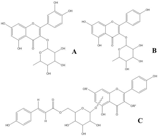 Chemical structure of the marker compounds (A) quercitrin [quercetin-3-rhamnoside], (B) afzelin [(kaempferol-3-O-rhamnoside], (C) kaempferol-3-O-(6″-p-coumaroylglucoside) or kaempferol-7-O-(6″-p-coumaroylglucoside).