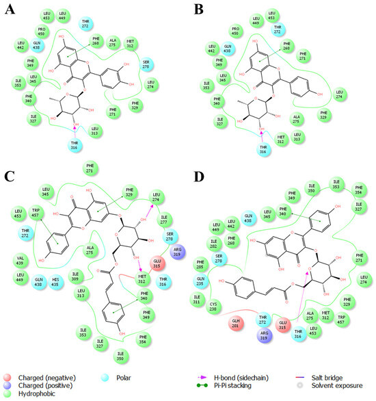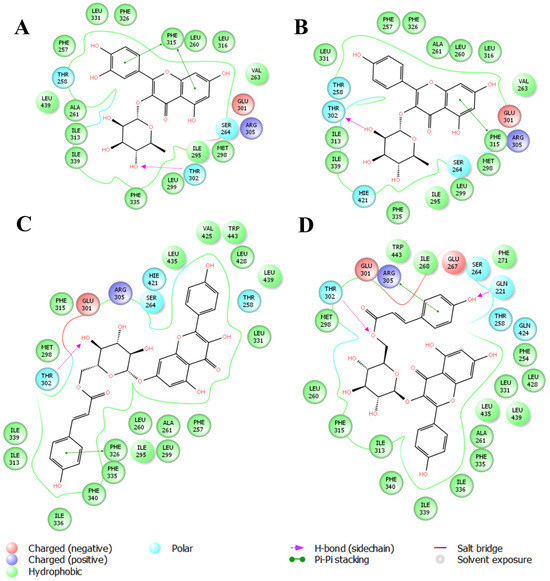 Binding modes of flavonoid compounds with LXRβ (PDB: 1PQ6). (A) shows quercitrin, (B) afzelin, (C) kaempferol 7-(6″-p-coumaroylglucoside), and (D) kaempferol 3-(6″-p-coumaroylglucoside).