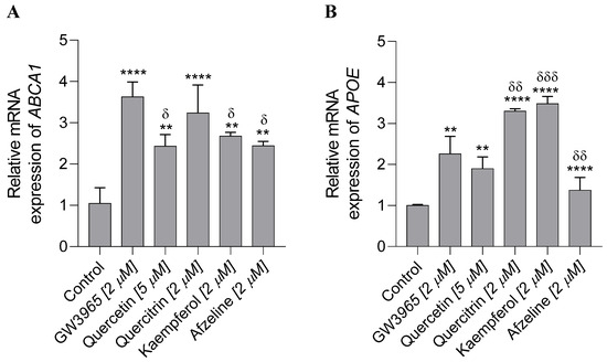 APOE and ABCA1 mRNA levels. U87 cells were treated with a control (vehicle) and the flavonoid compounds. qRT-PCR were used to examine the mRNA levels, and fold changes were calculated by the 2-ΔΔCt method as compared with non-infection cell control and using endogenous GAPDH mRNA level for normalization. (A) The fold change of ABCA1 in mRNA levels; (B) the fold change of APOE in mRNA levels. The data are shown as the mean ± SE from three sets of independent experiments. Differences against the control group: ** p < 0.01; **** p < 0.0001. Differences against the GW3965 group: δ p < 0.05; δδ p < 0.01; δδδ p < 0.001.
