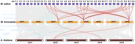 Syntenic analysis of DIC genes among M. sativa, M. trucatula, and Arabidopsis. Red lines connect orthologous DIC pairs. Grey lines connect other orthologous pairs.
