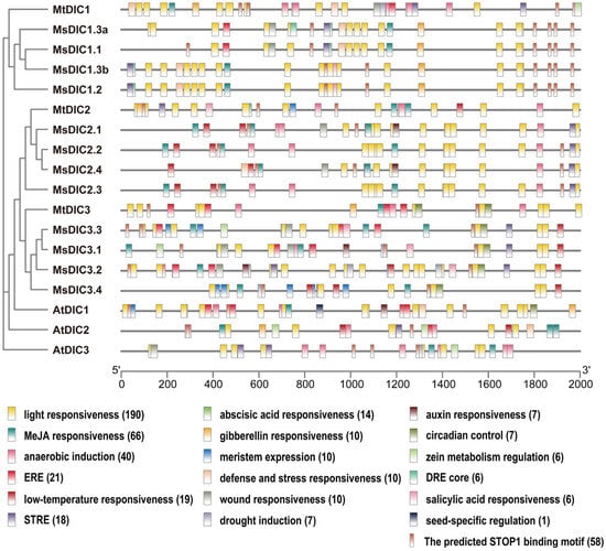 To explore the transcriptional regulatory mechanisms, we scanned the 2 kb promoter regions of Medicago and Arabidopsis DIC genes using the PlantCARE database (Figure 4 and Figure S6). Light-responsive elements (3-AF1 binding site, AE-box, Box 4, chs-CMA1a/2a, G-box, GT1-motif, I-box, MRE, Sp1, TCCC-motif, and TCT-motif) are the most abundant class, with Box 4 present in every Medicago DIC promoter. Hormone-responsive motifs for MeJA, ethylene, ABA, gibberellin, auxin and salicylic acid, together with stress- and development-associated elements, are also widespread. The TGACG-motif, MeJA-responsiveness element, is present in all DIC genes of Medicago and Arabidopsis. Significantly, the Al-resistance transcription factor STOP1 binding motif, identified from AtSTOP1 DAP-seq data [47], is found in the promoters of all Medicago and Arabidopsis DIC genes (Figure 4 and Table S5), suggesting the DIC family in Al signaling.
