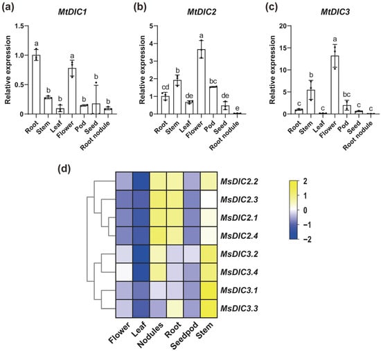 Tissue-specific expression of Medicago DIC genes: (a–c) qRT-PCR quantification of MtDIC1, MtDIC2 and MtDIC3 in R108 (WT) tissues (n = 3 independent pools). Expression is normalized to roots. Means ± SD. Different letters indicate significant differences (one-way ANOVA, Tukey’s test, p < 0.05). (d) Z-score heatmap of M. sativa DIC expression across tissues.