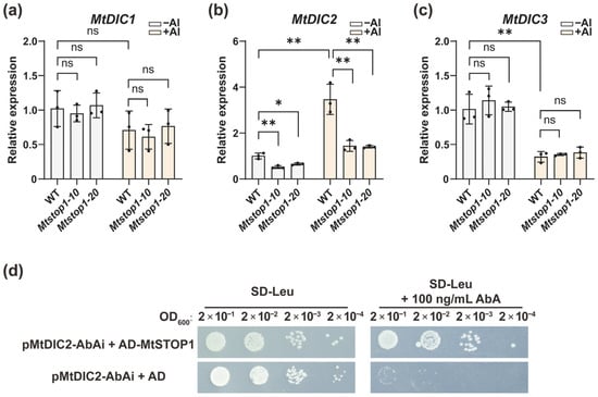 MtSTOP1 is required for Al-induced MtDIC2 expression in roots. qRT-PCR of MtDICs in root tips (a–c) of WT (R108), Mtstop1-10, and Mtstop1-20 (n = 3 independent pools): (a–c) Four-day-old seedlings treated ± 5 µM AlCl3 in 0.5 mM CaCl2 (pH 5.0, 6 h). Expression is relative to WT under 0 µM AlCl3 conditions. Means ± SD; * p < 0.05, ** p < 0.01 (two-tailed t-test); ns, not significant. (d) Interaction between MtSTOP1 and the MtDIC2 promoter in the yeast one-hybrid assay. Y1H Gold yeast strains carrying the pMtDIC2-AbAi were transformed with either AD-MtSTOP1 or the empty vector (AD alone). These transformed yeast strains were then subjected to a 10-fold serial dilution and cultured on SD-Leu medium or SD-Leu medium supplemented with Aureobasidin A (AbA). Growth on SD-Leu medium plus AbA indicates a positive interaction.
