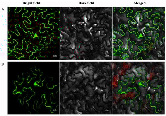 The full-length cDNA of the PtrMYB119 was synthesized by Nanjing Zoonbio Tech, Co., Ltd. (Nanjing, China) and inserted into a polylinker site of the binary vector pCAMBIA1302 to generate a fusion construct (p35S-PtrMYB119-GFP). After sequence verification, the fusion construct (p35S-PtrMYB119-GFP) and the control vector (pCAMBIA1302) were transferred into Agrobacterium tumefaciens strain GV3101 by heat shock. The abaxial surfaces of 5-week-old N. benthamiana leaves were agroinfiltration with the bacterial suspension (OD600 = 0.5) and then kept in an incubator for 24 h, followed by live cell imaging under an inverted confocal microscope (Zeiss LSM 780, Oberkochen, Germany). The images were presented with bright field, dark field, and a merge of bright field.