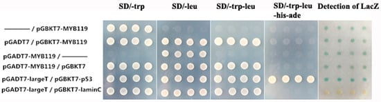 In addition to subcellular localization, transactivation activity is another defining feature of a transcription factor. The Y2H system was used to investigate whether PtrMYB119 functioned as a transcriptional activator. For this purpose, the coding sequence of PtrMYB119 was fused to the coding sequence of GAL4 to generate a fusion plasmid, which was transformed into yeast AH109 to see the growth status of cells on the nutritional selective medium. The positive control was pGADT7-large T/pGBKT7-p53, which showed better growth status of cells on the four nutritional selective medium (SD/-trp, SD/-leu, SD/-trp-leu, SD/-trp-leu-his-ade) and had blue colonies; the negative control was pGADT7-large T/pGBKT7-lamin C, which can grow well on the three nutritional selective media (SD/-trp, SD/-leu, SD/-trp-leu), and cannot grow on the nutritional selective medium of SD/-trp-leu-his-ade (Figure 2). The negative control cannot produce blue colonies compared with the positive control. There were slight blue colonies for the vectors containing PtrMYB119 compared with the positive control, indicating that PtrMYB119 had a weak transactivation activity. On the nutritional selective medium of SD/-trp-leu-his-ade, transgenic yeast cells harboring pGBKT7-MYB119, pGADT7-MYB119, pGADT7/pGBKT7-MYB119, or pGADT7-MYB119/pGBKT7 were able to grow; however, the positive control grew better compared with these transgenic yeast cells (Figure 2). Taken together, these results demonstrated that PtrMYB119 had a weak transactivation activity in yeast cells.