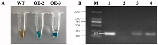 (A) GUS staining of transgenic plants overexpressing PtrMYB119 (OE-1, transgenic OE-1 line; OE-2, transgenic OE-2 line; OE-3, transgenic OE-3 line). (B) PCR detection of transgenic plants overexpressing PtrMYB119 (M, marker; 1, PtrMYB119 vector; 2, WT; 3, transgenic OE-2 line; 4, transgenic OE-3 line).