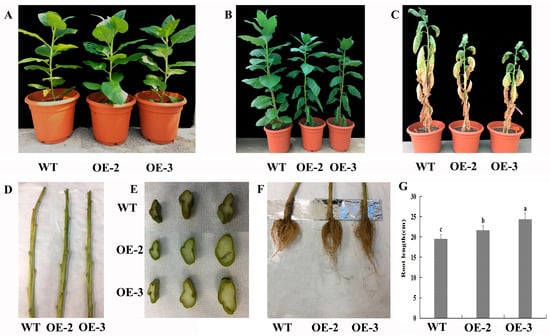 (A) Transgenic and WT tobacco before drought treatment. (B) Growth of transgenic and WT lines after 10 days of drought treatment. (C) Growth of transgenic and WT lines after 30 days of drought treatment. (D) Stem after 30 days of drought treatment. (E) Cross-section of the same part of the stem of transgenic and WT lines. Data are means ± SE of three biological replicates, and means followed by different letters are significantly different (p < 0.05). (F) Root growth after 30 days of drought treatment. (G) Root length after 30 days of drought treatment (OE-1, transgenic OE-1 line; OE-2, transgenic OE-2 line; OE-3, transgenic OE-3 line).
