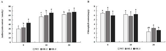 (A) Anthocyanin content in transgenic and WT plants after drought treatment. (B) Chlorophyll content in transgenic and WT plants after drought treatment. Data are means ± SE of three biological replicates, and means followed by different letters are significantly different (p < 0.05). The X-axis is the days of drought treatment (OE-2, transgenic OE-2 line; OE-3, transgenic OE-3 line).