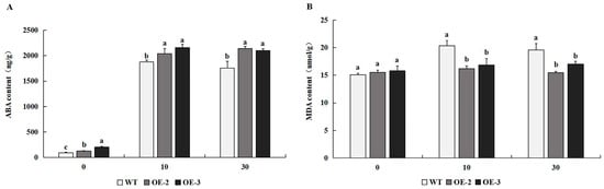 (A) ABA concentration in transgenic and WT plants after drought treatment. (B) MDA content in transgenic and WT plants after drought treatment. Data are means ± SE of three biological replicates, and means followed by different letters are significantly different (p < 0.05). The X-axis is the days of drought treatment (OE-2, transgenic OE-2 line; OE-3, transgenic OE-3 line).
