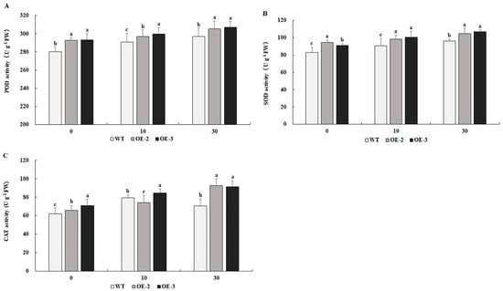 Antioxidant enzyme activities in transgenic and WT plants under drought treatment. (A) POD, (B) SOD, (C) CAT. Data are means ± SE of three biological replicates, and means followed by different letters are significantly different (p < 0.05). The X-axis is the days of drought treatment (OE-2, transgenic OE-2 line; OE-3, transgenic OE-3 line).