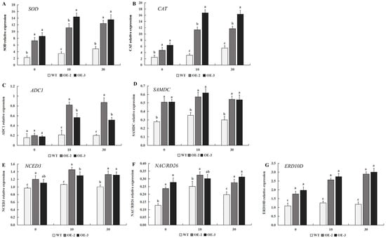 Expression levels of drought-related genes in transgenic and WT plants under drought stress. (A) Antioxidant enzyme-coding genes SOD. (B) Antioxidant enzyme-coding genes CAT. (C) Polyamine biosynthesis genes ADC1. (D) Polyamine biosynthesis genes SAMDC. (E) Drought-responsive genes NCED3. (F) Drought-responsive genes NAC/RD26. (G) Drought-responsive genes ERD10D. Data are means ± SE of three biological replicates, and means followed by different letters are significantly different (p < 0.05). The X-axis is the days of drought treatment (OE-2, transgenic OE-2 line; OE-3, transgenic OE-3 line).
