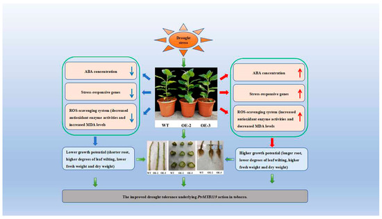 In summary, PtrMYB119 overexpression lines showed elevated ABA content, antioxidant enzyme activity, drought stress-responsive gene expression levels, and reduced MDA content following drought treatment, suggesting that PtrMYB119 modulated tolerance to drought in tobacco (Figure 10). The results of this study indicated that PtrMYB119 played an important role in response to drought stress in tobacco and may be a potential gene for improving drought tolerance in other plants. In addition, the drought tolerance function of the PtrMYB119 gene has only been validated in tobacco, and further validation is needed in other woody plants such as poplar trees.