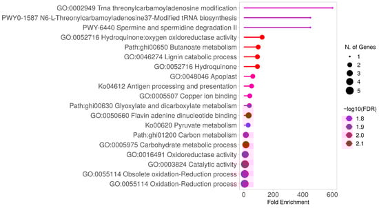 Functional Annotation and Pathway Analysis of Candidate Genes in Cotton Meta-QTL Regions. The X-axis represents fold enrichment, while the color gradient indicates the −log10(FDR) value, corresponding to the statistical significance of enrichment. Significant enrichment was defined as p < 0.05 and −log10(FDR) > 1.3 [78]. Abbreviations: MQTL—Meta-QTL; GO—Gene Ontology; FDR—False Discovery Rate.