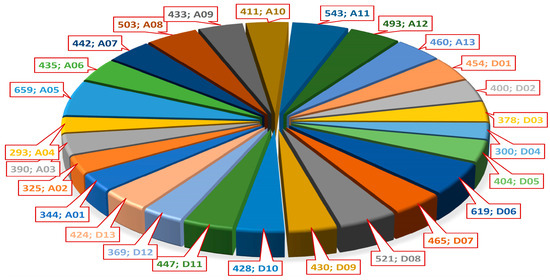 Chromosome-wise distribution of molecular markers in the consensus genetic map. Each wedge of the pie chart represents the number of markers assigned to individual chromosomes (e.g., 659 on A05, 503 on A08, 619 on D06, etc.), highlighting marker density across the A and D sub-genomes of cotton. A-subgenome chromosomes are labeled A01–A13, and D-subgenome chromosomes are labeled D01–D13, according to the standard cotton genome nomenclature [95].