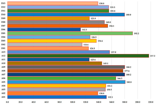 Total genetic map length (cM) of each chromosome in the consensus map. The bar chart represents the cumulative genetic distance (in centimorgan, cM) for each of the 26 chromosomes (A01–A13 and D01–D13). Chromosomes A12 (217.2 cM), D05 (192.2 cM), and A08 (180.2 cM) exhibited the longest map length, suggesting extended recombination distances and potentially higher marker density or saturation in these regions. Abbreviation: cM—centiMorgan.