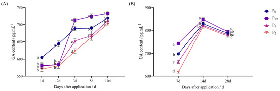 Figure 2A shows the pot experiment: 1 d after application, the GA content in the concentration treatments decreased by 3.91%, 4.17%, and 5.65% compared with P0. Two days after application, the concentration treatments decreased by 9.35%, 9.46%, and 9.94% compared with P0. Three days after application, the P1/2 treatment increased by 3.50% compared with P0, while the P1 and P2 treatments decreased by 5.25% and 9.47% compared with P0. Then, 5 d after application, the P1/2 treatment increased by 5.05% compared with P0, while the P1 and P2 treatments decreased by 3.14% and 3.88% compared with P0. Ten days after application, the P1 treatment exhibited no significant difference from P0. The P1/2 treatment increased by 1.86% compared with P0, and the P2 treatment decreased by 2.45% compared with P0.