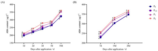 Effect of penoxsulam on ABA content of foxtail millet. (A) Pot experiment, (B) field experiment. Comparison between treatments of different concentrations on the same day, with lowercase letters representing a significant difference (p < 0.05). P0–P2 represent four different spraying doses of 0, 15, 30, and 60 g a.i. Ha−1, respectively.