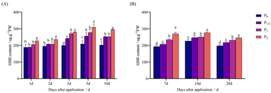 Effect of penoxsulam on GSH content of foxtail millet. (A) Pot experiment, (B) field experiment. Comparison between treatments of different concentrations on the same day, with lowercase letters representing a significant difference (p < 0.05). P0–P2 represent four different spraying doses of 0, 15, 30, and 60 g a.i. Ha−1, respectively.