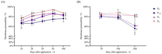 As shown in Figure 7B, in the field experiment, the MP of the P1/2 treatment exhibited no significant difference from P0. Seven days after application, the P1 and P2 treatments increased by 6.20% and 7.87% compared with P0. Fourteen days after application, the P1/2 and P1 treatments exhibited no significant difference from P0, while the P2 treatment increased by 13.44% compared with P0. Finally, 28 d after application, the P1/2 treatment exhibited no significant difference from P0, while the P1 and P2 treatments increased by 46.42% and 46.20% compared with P0.