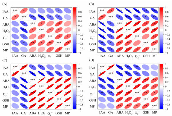 Seven days after treatment (field), the IAA and GA contents were negatively correlated with antioxidant system-related indexes and the ABA content was positively correlated (Figure 8F). Fourteen days after treatment, the IAA and GA contents were negatively correlated with ABA content, and ABA content was positively correlated with antioxidant system-related indexes (Figure 8G). Finally, 28 d after treatment, the IAA content was negatively correlated and ABA content was positively correlated with antioxidant system-related indexes (Figure 8H).