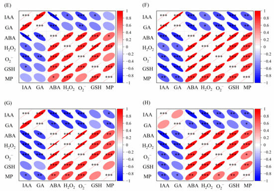 Correlation between endogenous hormones in the leaves and defense system of the antioxidant system. (A) Pot experiment, 1 d after treatment; (B) pot experiment, 2 d after treatment; (C) pot experiment, 3 d after treatment; (D) pot experiment, 5 d after treatment; (E) pot experiment, 10 d after treatment; (F) field experiment, 7 d after treatment; (G) field experiment, 14 d after treatment; (H) field experiment, 28 d after treatment. The color depth of the heatmap represents the correlation coefficient (red: positive correlation; blue: negative correlation); * p ≤ 0.05, ** p ≤ 0.01, *** p ≤ 0.001; each data point is the average of 4 biological replicates (pot experiment) or 4 field replicates (field experiment). All correlation analysis data are from the original determination values of this study.