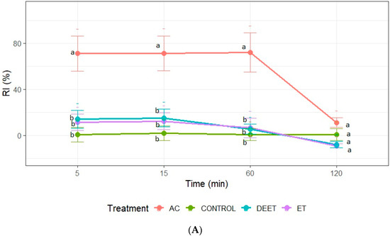 Repellence was recorded only at concentrations of 25 and 50 µg/cm2. At the maximum concentration, acetone and DEET achieved a similar repellent effect with values close to 100% at all evaluation times. In the case of ethanol extract, its effect was similar to acetone extract and DEET only at 5, 15, and 60 min, losing its repellent effect after 120 min of exposure to insects (Figure 2). It should be noted that only acetone extract demonstrated a repellent effect on the nymphs at the concentration of 25 µg/cm2. The repellent activity of the extract was recorded during the first 60 min of exposure. Statistical analysis confirmed that the RI values of the acetone extract were significantly higher than those of the ethanol extract and the negative control (ANOVA, p < 0.05; Tukey’s test) (Figure 2).