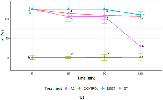Repellence index (RI) of C. sativa extracts (AC: acetone extract; ET: ethanol extract), control (acetone or ethanol), and positive control (DEET) at 25 µg/cm2 (A); and (B) 50 µg/cm2 against fifth-instar nymphs of T. infestans. Bars express 95% confidence intervals. Different letters indicate statistically significant differences (p < 0.05; non-overlapping 95% confidence intervals).