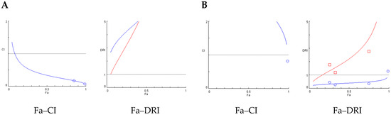 Chou-Talalay (Fa–CI) and the Fa–Chou–Martin DRI plot (Fa–DRI) for constant ratio combination treatments. Blue curves correspond to the extracts alone, while red curves represent the combination treatments Left: Fa–CI plots, where Fa is the fraction affected and CI the combination index (CI < 1 indicates synergism, CI = 1 additivity, CI > 1 antagonism). Right: Fa–DRI plots, where DRI is the dose reduction index (values > 1 indicate favorable dose reduction). (A) Fa–CI and Fa–DRI plots for the AE and β-caryophyllene combination at 48 h; (B) Fa–CI and Fa–DRI plots for the AE + E-ocimene combination at 48 h.
