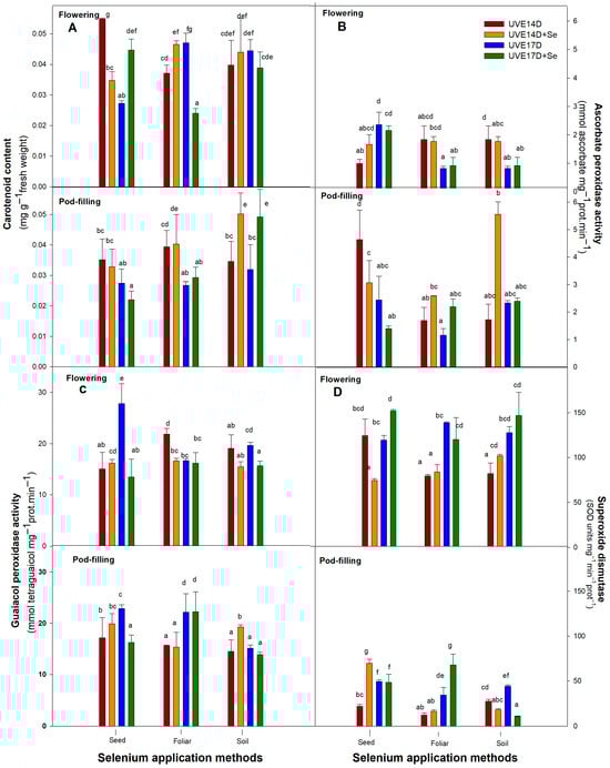 Antioxidative mechanisms such as carotenoids, ascorbate peroxidase (APX), Guaiacol peroxidase (GPX), and superoxide dismutase (SOD) play a crucial role in maintaining ROS balance within plant cells. Figure 3A represents the carotenoid content of drought-stressed vegetable soybean cultivars grown under the different selenium application methods. During the flowering stage, there was a significant increase in carotenoid content (32%) in cultivar UVE17, while a notable decrease (36%) was observed in UVE14 under the seed application method. Foliar application significantly increased carotenoid content in UVE14 (26%) but decreased it in UVE17. Notably, at the pod-filling stage, soil treatment increased carotenoid content significantly for both cultivars, UVE14 (45%) and UVE17 (54%).